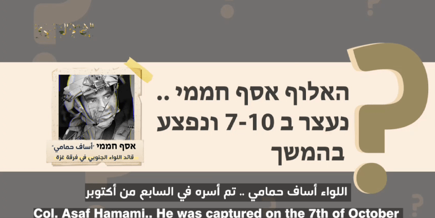 كشف يوسي يهوشع، مراسل الشؤون العسكرية لصحيفة “يديعوت أحرنوت”، أن جزءًا من مقاتلي كتائب القسام الذين نفذوا عملية طوفان الأقصى يوم 7 تشرين أول/أكتوبر، كانوا يبحثون عن العقيد اساف حمامي، قائد اللواء الجنوبي لفرقة غزة في جيش الاحتلال، ويحملون صورًا له لمساعدتهم في الوصول إليه، قبل أن ينجحوا بالفعل في قتله.