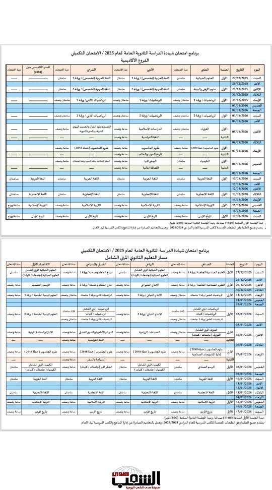 ويبدأ أول أيام الامتحانات يوم السبت الموافق 27 كانون الأول 2025، وتُختتم يوم السبت الموافق 17 كانون الثاني 2026.