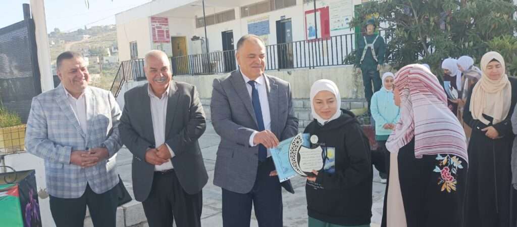 وتم تكريم الطالبات الفائزات وهن ، مجد قصي بني حمد ، وزين مصطفى بني حمد ويارا محمود بني حمد، واستبرق أحمد بني حمد ، وكذلك تم تكريم المعلمة المشرفة على تدريب الطالبات “سونا بني عامر” بحضور الهيئة التدريسية والإدارية.