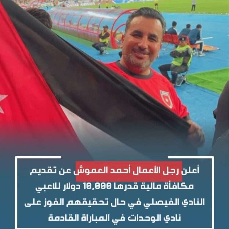صدى الشعب – أعلن رجل الأعمال أحمد العموش عن تقديمه مكافأة مالية قدرها عشرة آلاف دينار للاعبي النادي الفيصلي في حالة فوزهم على فريق الوحدات في المباراة المقررة بين القطبين يوم الجمعة القادم ضمن منافسات دوري المحترفين لكرة القدم في إطار الجولة 16.