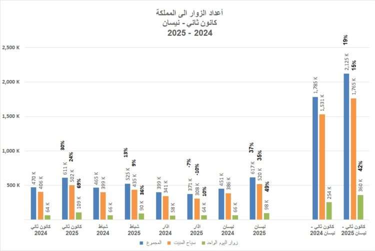 وبحسب التقرير الشهري الصادر عن وزارة السياحة والآثار، بلغ إجمالي عدد الزوار الدوليين خلال الفترة من (كانون الثاني – نيسان) من عام 2025، نحو 2.125 مليون زائرًا بنسبة ارتفاع 19 % مقارنة بنفس الفترة من عام 2024، والتي بلغ فيها عدد الزوار 1.785 مليون زائرًا.