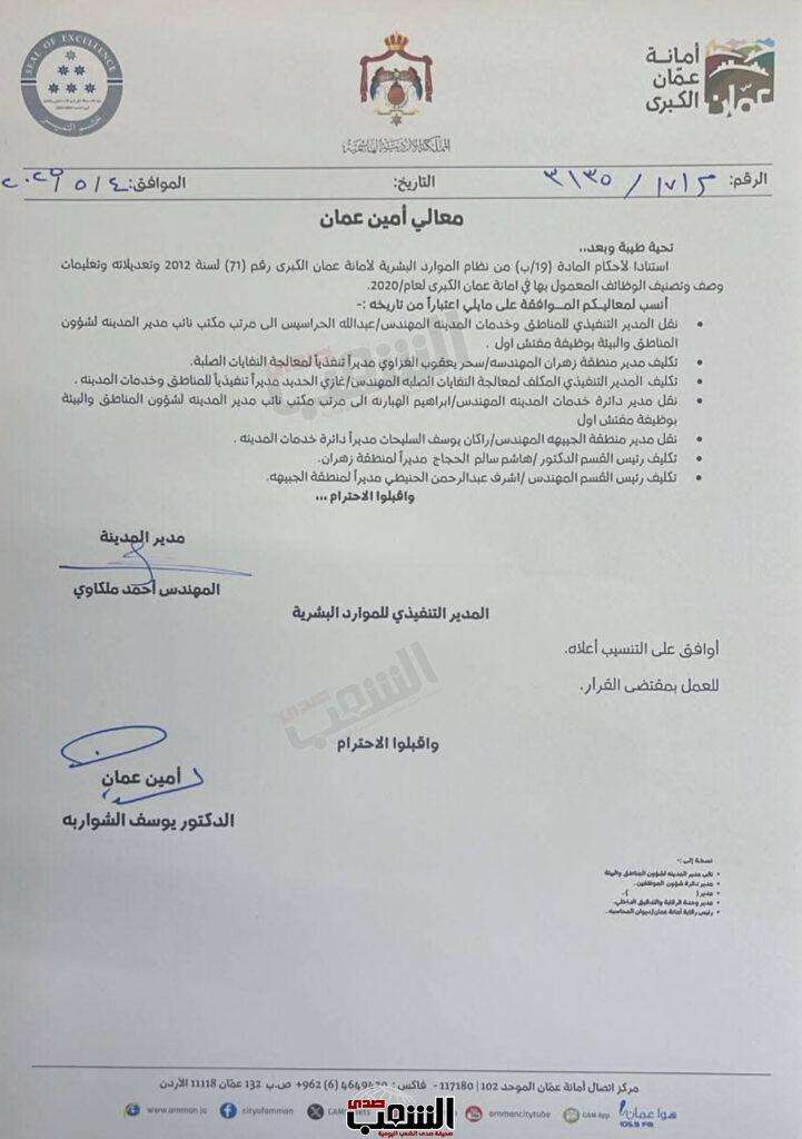 صدى الشعب – وافق أمين عمان، الدكتور يوسف الشواربة على تنسيب من مدير المدينة، المهندس أحمد الملكاوي على عدد من التنقلات بين كبار المدراء.