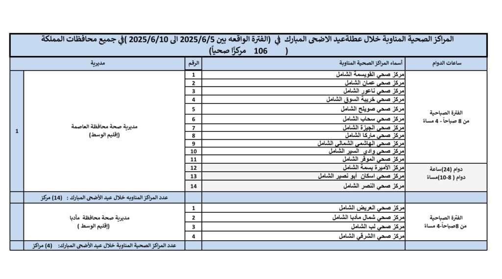 صدى الشعب – أعلنت وزارة الصحة، اليوم الأربعاء، عن أسماء 106 مراكز صحية من مراكزها في محافظات المملكة كافة، للمناوبة واستقبال المراجعين خلال فترة عطلة عيد الأضحى المبارك.