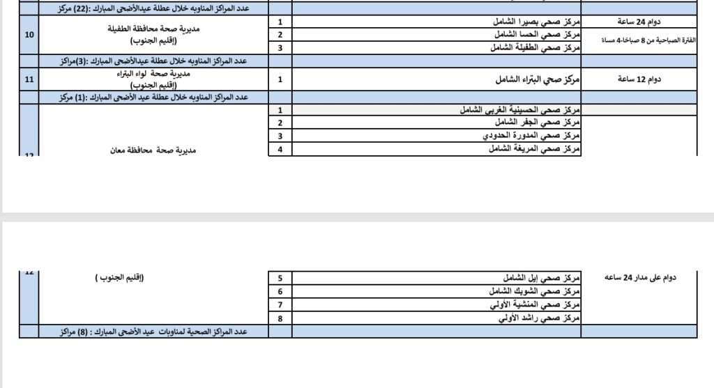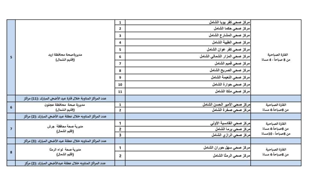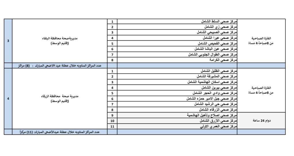 وبينت الوزارة أن المراكز ستعمل خلال عطلة العيد من 5 حزيران إلى 10 حزيران، وفقا لمواعيد عمل محددة منها ،وذلك من الساعة 8 صباحا الى 4 مساء، وبعضها 12 ساعة، إضافة إلى مراكز تعمل على مدار 24 ساعة.
