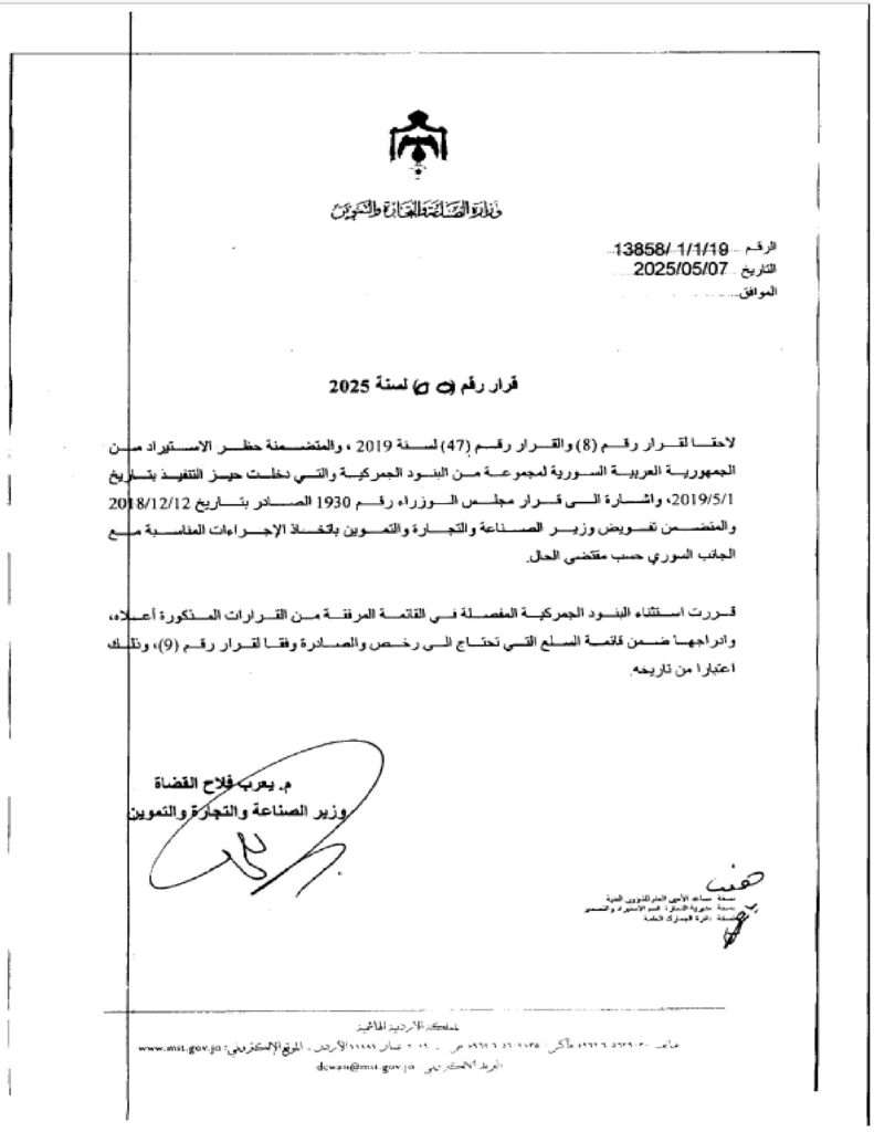 قرر وزير الصناعة والتجارة والتموين المهندس يعرب القضاة، استثناء عدد من البنود الجمركية الواردة في القائمة المرفقة من قراري الحظر رقم (8) ورقم (47) لسنة 2019، والمتضمنين حظر الاستيراد من الجمهورية العربية السورية، والتي دخلت حيز التنفيذ اعتبارا من تاريخ 2019/5/1.