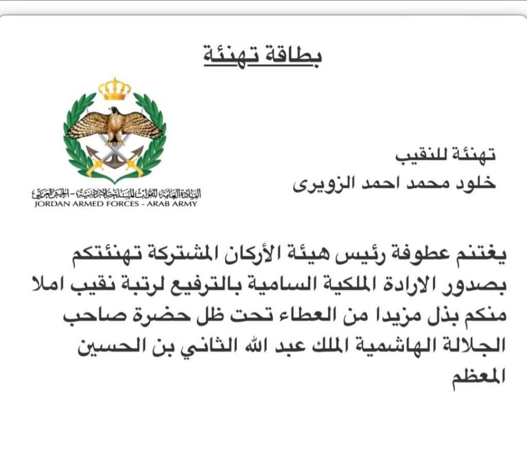 صدى الشعب – يتقدم مدير تحرير (وكالة صدى الشعب الإخبارية)، الزميل بهاء سلامة بأجمل التهاني و التبريكات الممزوجة بالفخر، للصديقة و الزميلة في الإعلام العسكري (النقيب خلود محمد أحمد الزويري)، بمناسبة صدور الإرادة الملكية السامية بترفيعها لرتبة نقيب في القوات المسلحة الأردنية ..