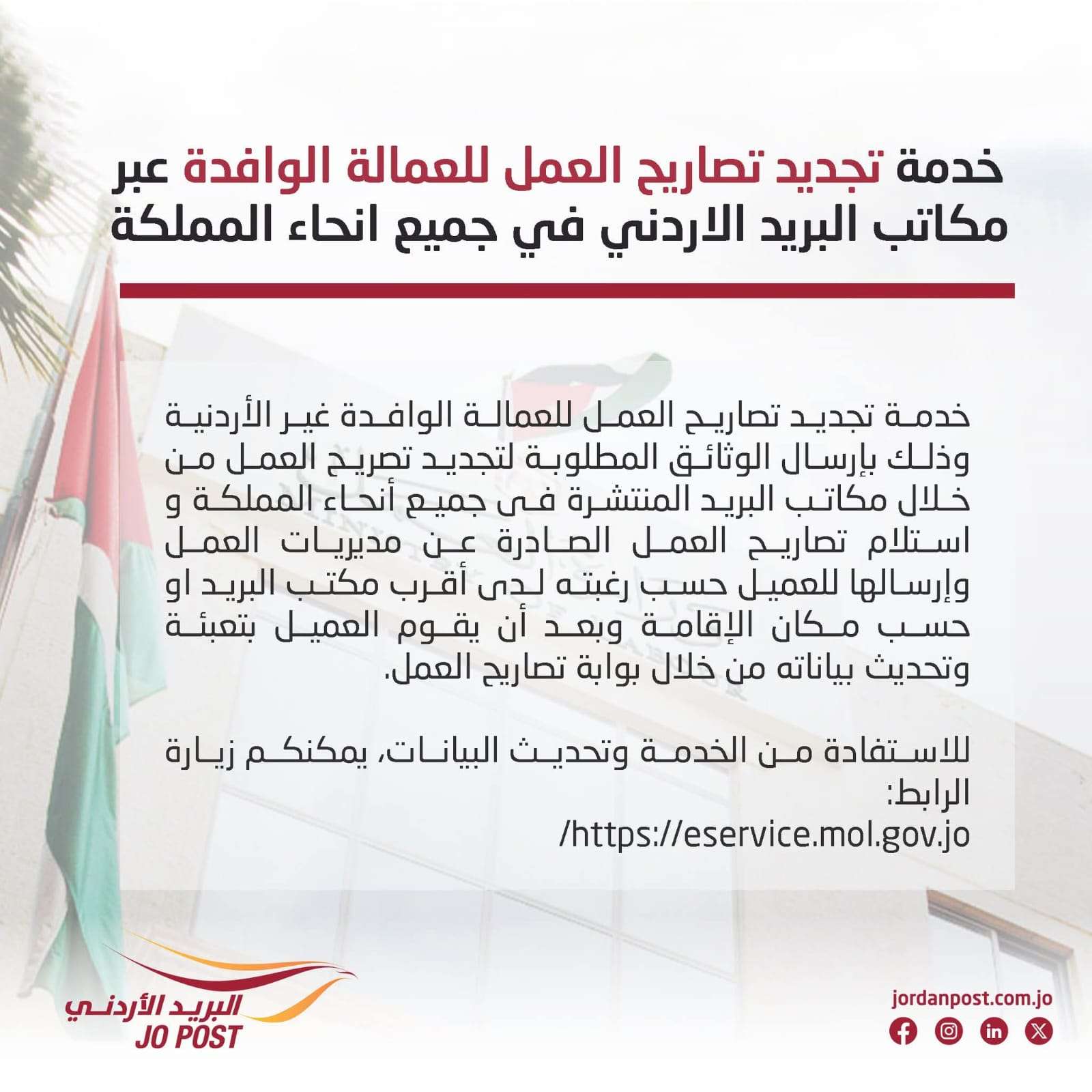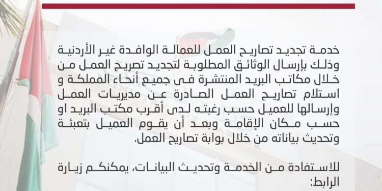 أعلن البريد الأردني عن إطلاق خدمة تجديد تصاريح العمل للعمالة الوافدة غير الأردنية وذلك بإرسال الوثائق المطلوبة لتجديد تصريح العمل من خلال مكاتب البريد المنتشرة في جميع أنحاء المملكة و استلام تصاريح العمل الصادرة عن مديريات العمل وإرسالها للعميل حسب رغبته لدى أقرب مكتب البريد او حسب مكان الإقامة وبعد أن يقوم العميل بتعبئة وتحديث بياناته من خلال بوابة تصاريح العمل الموجودة بالرابط أدناه:-