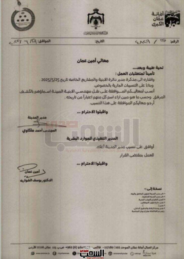 صدى الشعب - قرر مدير المدينة في أمانة عمان الكبرى، المهندس أحمد الملكاوي بالتنسيب لأمين عمان بإجراء تنقلات بين عشرات مهندسي الأبنية، كما يوضح الجدول التالي: