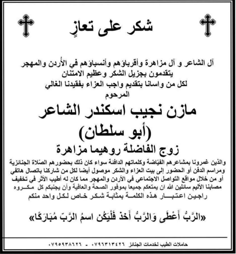 صدى الشعب - آل الشاعر و آل مزاهرة و أقرباؤهم و أنسباؤهم في الأردن و المهجر يتقدمون بجزيل الشكر و عظيم الامتنان لكل من واساهم بتقديم واجب العزاء بفقيدهم الغالي المرحوم مازن نجيب اسكندر الشاعر (أبو السلطان)، زوج الفاضلة روهيما مزاهرة الرب أعطى و الرب أخذ فليكن اسم الرب مباركاً