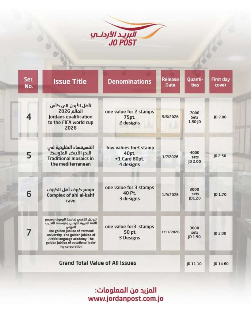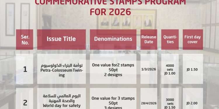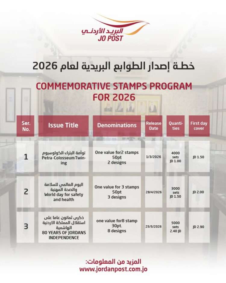 صدى الشعب – أعلن البريد الأردني عن خطة إصدارات الطوابع التذكارية لعام 2026 والتي تتضمن مجموعة مميزة من الطوابع التي توثّق أحداثًا ومحطات خالدة من تاريخ وثقافة وحضارة الاردن.