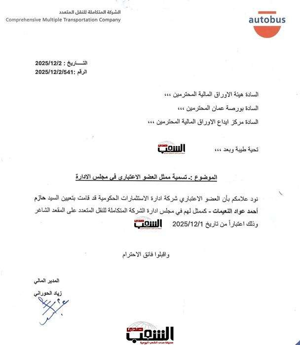 قررت حكومة الدكتور جعفر حسان، بتسمية نائب أمين عمان الأسبق، المحامي حازم أحمد عواد النعيمات، ممثلاً لها من خلال (شركة إدارة الاستثمارات الحكومية) في الشركة المتكاملة للنقل المتعدد، اعتباراً من 1–12–2025، في المقعد الشاغر بحسب ما أشارت الوثيقة التي حصلت عليها (كواليس صدى)، وتلي السطور..