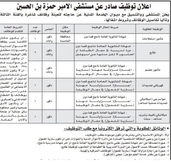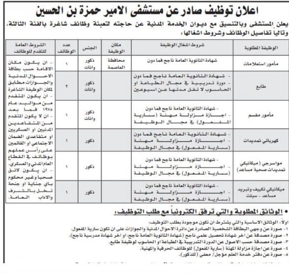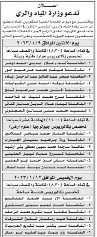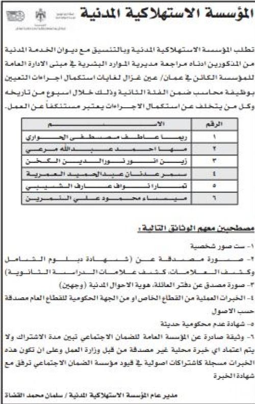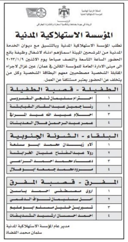 <!-- wp:paragraph {"textColor":"black"} --> <p class="has-black-color has-text-color">صدى الشعب - كشفت عدداً من الوزارات والمؤسسات الحكومية، بالتنسيق مع ديوان الخدمة المدنية، عن حاجتها لتعيين وتعبيئة وظائف شاغرة وإجراء مقابلات شخصية.<br><br>ودعت المؤسسات المدرجة أسماؤهم أدناه لاصطحاب الوثائق اللازمة للتعيين.<br><br>التفاصيل: </p> <!-- /wp:paragraph --> <!-- wp:image {"width":382,"height":487} --> <figure class="wp-block-image is-resized"><img src="https://www.assawsana.com/image.php?token=c3b49a0640236e21fd5ef90b89e6fb7e&size=large" alt="" width="382" height="487"/></figure> <!-- /wp:image --> <!-- wp:image {"width":385,"height":609} --> <figure class="wp-block-image is-resized"><img src="https://www.assawsana.com/image.php?token=b4e78243fa7f80473e5b872280a5e6ce&size=large" alt="" width="385" height="609"/></figure> <!-- /wp:image --> <!-- wp:image {"width":384,"height":520} --> <figure class="wp-block-image is-resized"><img src="https://www.assawsana.com/image.php?token=4d28e2091210449e3a19cc40076b85f0&size=large" alt="" width="384" height="520"/></figure> <!-- /wp:image --> <!-- wp:image {"width":393,"height":746} --> <figure class="wp-block-image is-resized"><img src="https://www.assawsana.com/image.php?token=0782ddef7ee790a5e70073e62973a575&size=large" alt="" width="393" height="746"/></figure> <!-- /wp:image --> <!-- wp:image {"width":395,"height":741} --> <figure class="wp-block-image is-resized"><img src="https://www.assawsana.com/image.php?token=6bab7ea36e0afb7cc8e4dba54b1b3fc0&size=large" alt="" width="395" height="741"/></figure> <!-- /wp:image --> <!-- wp:image {"width":385,"height":938} --> <figure class="wp-block-image is-resized"><img src="https://www.assawsana.com/image.php?token=797949158d14cb38e426fcace77b0f9a&size=large" alt="" width="385" height="938"/></figure> <!-- /wp:image --> <!-- wp:image {"width":386,"height":366} --> <figure class="wp-block-image is-resized"><img src="https://www.assawsana.com/image.php?token=704e07aa6d532d26afb9dec38dd64bc1&size=large" alt="" width="386" height="366"/></figure> <!-- /wp:image --> <!-- wp:image {"width":383,"height":324} --> <figure class="wp-block-image is-resized"><img src="https://www.assawsana.com/image.php?token=09b6822bedabb2d0591f0bdc543b71fd&size=large" alt="" width="383" height="324"/></figure> <!-- /wp:image --> <!-- wp:image {"width":384,"height":373} --> <figure class="wp-block-image is-resized"><img src="https://www.assawsana.com/image.php?token=befa3d3172c3ef5140526ea4d904eb94&size=large" alt="" width="384" height="373"/></figure> <!-- /wp:image --> <!-- wp:image {"width":385,"height":491} --> <figure class="wp-block-image is-resized"><img src="https://www.assawsana.com/image.php?token=c3b49a0640236e21fd5ef90b89e6fb7e&c=9493004&size=large" alt="" width="385" height="491"/></figure> <!-- /wp:image --> <!-- wp:image {"width":388,"height":614} --> <figure class="wp-block-image is-resized"><img src="https://www.assawsana.com/image.php?token=b4e78243fa7f80473e5b872280a5e6ce&c=2961708&size=large" alt="" width="388" height="614"/></figure> <!-- /wp:image --> <!-- wp:image {"width":392,"height":531} --> <figure class="wp-block-image is-resized"><img src="https://www.assawsana.com/image.php?token=4d28e2091210449e3a19cc40076b85f0&c=6079139&size=large" alt="" width="392" height="531"/></figure> <!-- /wp:image --> <!-- wp:image {"width":394,"height":748} --> <figure class="wp-block-image is-resized"><img src="https://www.assawsana.com/image.php?token=0782ddef7ee790a5e70073e62973a575&c=6462808&size=large" alt="" width="394" height="748"/></figure> <!-- /wp:image --> <!-- wp:image {"width":397,"height":745} --> <figure class="wp-block-image is-resized"><img src="https://www.assawsana.com/image.php?token=6bab7ea36e0afb7cc8e4dba54b1b3fc0&c=8227745&size=large" alt="" width="397" height="745"/></figure> <!-- /wp:image --> <!-- wp:image {"width":386,"height":940} --> <figure class="wp-block-image is-resized"><img src="https://www.assawsana.com/image.php?token=797949158d14cb38e426fcace77b0f9a&c=5206433&size=large" alt="" width="386" height="940"/></figure> <!-- /wp:image --> <!-- wp:image {"width":387,"height":367} --> <figure class="wp-block-image is-resized"><img src="https://www.assawsana.com/image.php?token=704e07aa6d532d26afb9dec38dd64bc1&c=1312807&size=large" alt="" width="387" height="367"/></figure> <!-- /wp:image --> <!-- wp:image {"width":382,"height":323} --> <figure class="wp-block-image is-resized"><img src="https://www.assawsana.com/image.php?token=09b6822bedabb2d0591f0bdc543b71fd&c=2425277&size=large" alt="" width="382" height="323"/></figure> <!-- /wp:image --> <!-- wp:image {"width":379,"height":368} --> <figure class="wp-block-image is-resized"><img src="https://www.assawsana.com/image.php?token=befa3d3172c3ef5140526ea4d904eb94&c=4103796&size=large" alt="" width="379" height="368"/></figure> <!-- /wp:image -->