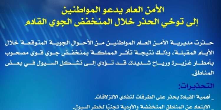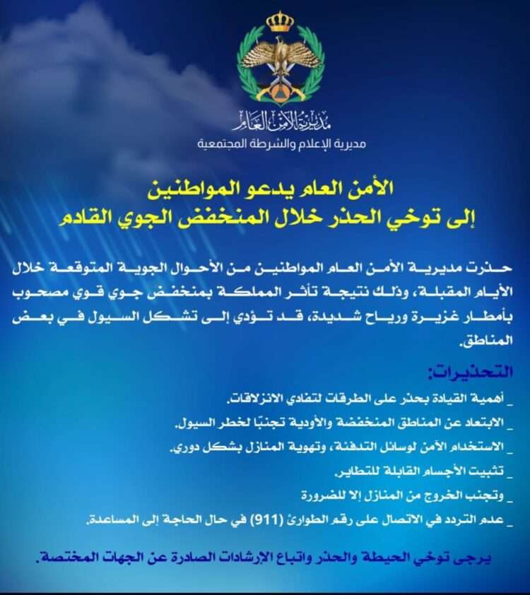 صدى الشعب – حذرت مديرية الأمن العام المواطنين من الأحوال الجوية المتوقعة خلال الأيام المقبلة، وذلك نتيجة تأثر المملكة بمنخفض جوي قوي مصحوب بأمطار غزيرة ورياح شديدة، قد تؤدي إلى تشكل السيول في بعض المناطق.
