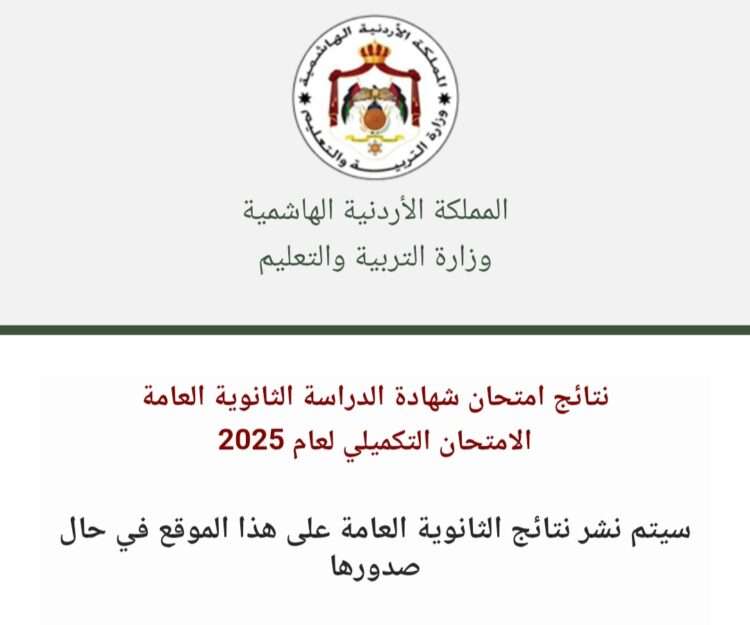 وتعلن الوزارة، عند الساعة الخامسة مساء اليوم، نتائج الامتحان التكميلي لشهادة الدراسة الثانوية العامة (التوجيهي) للعام 2025 عبر الرابط الإلكتروني (https://tawjihi.jo).