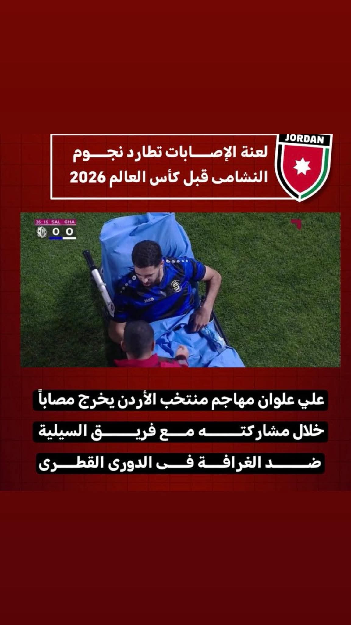 وتمنت جماهير كرة القدم الأردنية أن تكون الفحوص الطبية التي سيجريها علوان في الساعات المقبلة مطمئنة لئلا يغيب طويلاً عن الملاعب ويعود للمشاركة مع منتخب النشامى في كأس العالم.