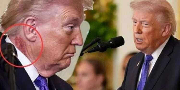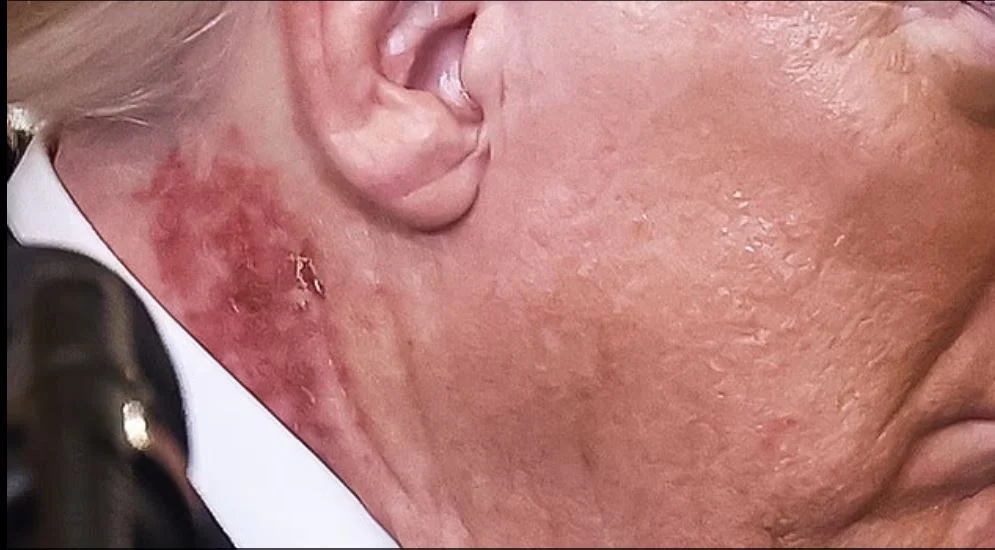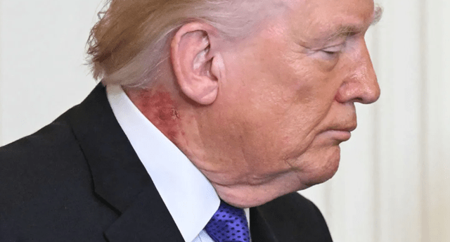 وظهر طفح جلدي أحمر على الجانب الأيمن من رقبة ترامب فوق خط الياقة مباشرة في صور التُقطت له خلال مشاركته في مراسم منح وسام الشرف الاثنين.