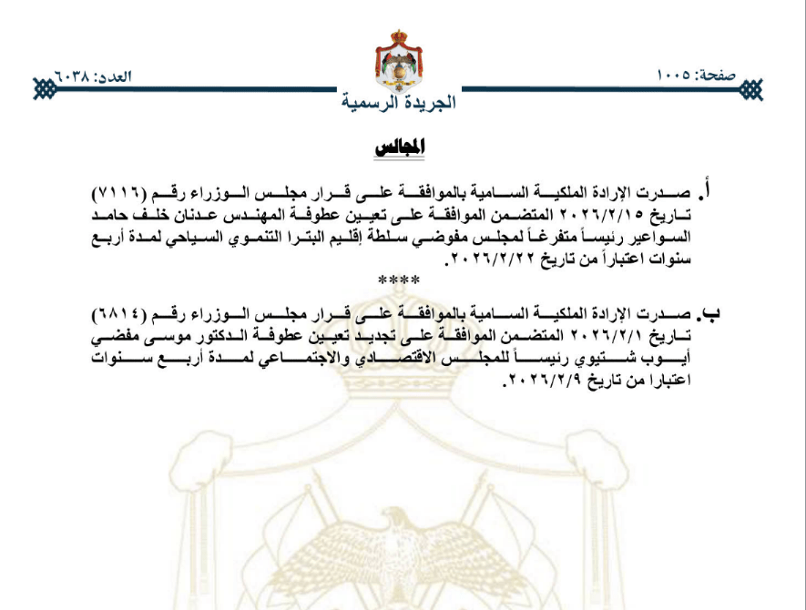 صدى الشعب – صدرت الإرادة الملكية السامية في عدد الجريدة الرسمية اليوم الخميس، بالموافقة على قرار مجلس الوزراء المتضمن تعيين المهندس عدنان السواعير رئيسًا متفرغًا لمجلس مفوضي سلطة إقليم البترا التنموي السياحي لمدة أربع سنوات.