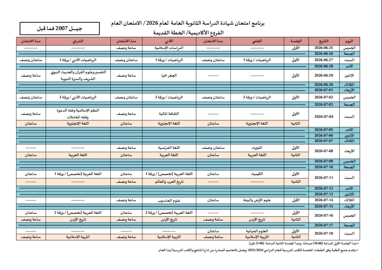 صدى الشعب – أعلنت وزارة التربية والتعليم الأحد، عن جدول امتحانات شهادة الدراسة الثانوية العامة لعام 2026 لطلبة الصف الثاني عشر.
