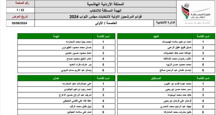 صدى الشعب – نشرت الهيئة المستقلة للانتخاب اليوم الاثنين، عبر موقعها الالكتروني القوائم الأولية للمرشحين، التي تم قبولها وعددها (174) قائمة مرشحة عن الدوائر الانتخابية المحلية، و(25) قائمة مرشحة على الدائرة الانتخابية العامة المخصصة للأحزاب.