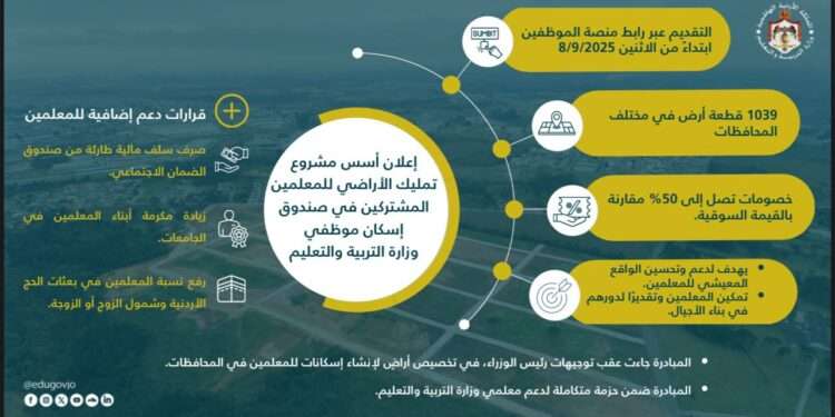 وقال الناطق الإعلامي باسم الوزارة محمود حياصات، إن الوزارة قامت بإضافة رابط على موقعها الإلكتروني يُبين مواقع المشاريع، وأسس مشروع تمليك الأراضي للمعلمين المشتركين في صندوق إسكان موظفي الوزارة لسنة 2025، مشيرًا إلى أن التقدم يبدأ اعتبارًا من صباح يوم الاثنين القادم 8/9/2025 ولغاية مساء يوم الثلاثاء 30/9/2025، عن طريق رابط منصة الموظفين( https://emp.moe.gov.jo )
