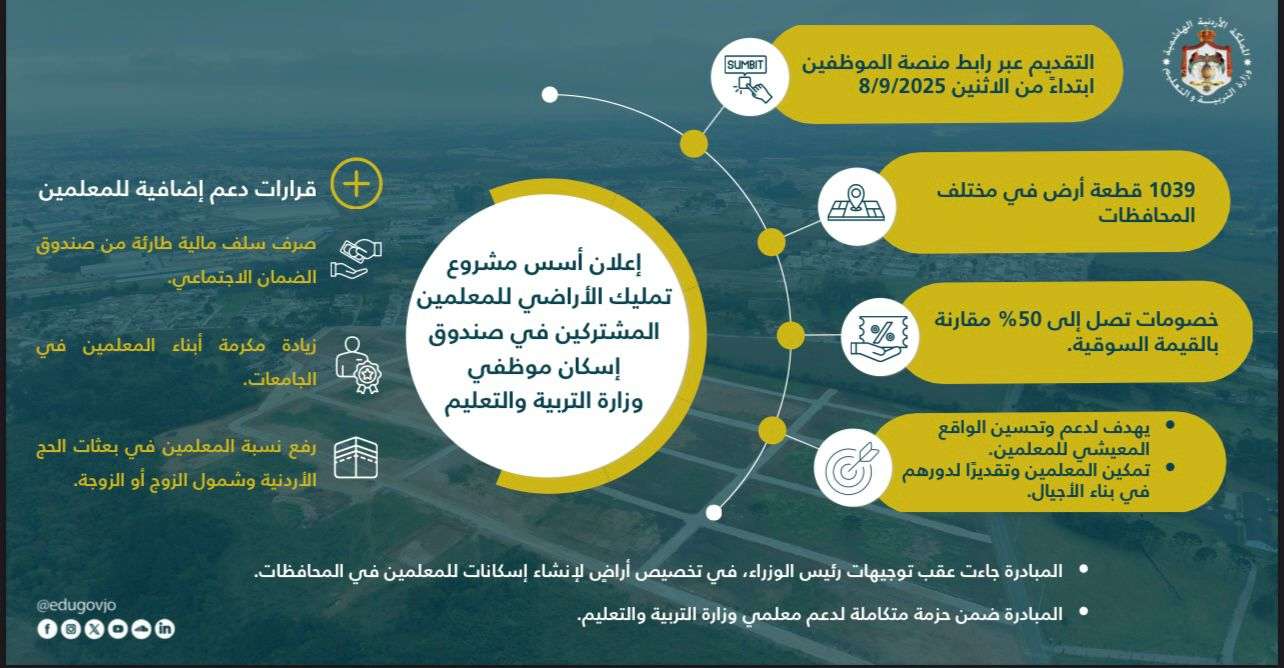 وقال الناطق الإعلامي باسم الوزارة محمود حياصات، إن الوزارة قامت بإضافة رابط على موقعها الإلكتروني يُبين مواقع المشاريع، وأسس مشروع تمليك الأراضي للمعلمين المشتركين في صندوق إسكان موظفي الوزارة لسنة 2025، مشيرًا إلى أن التقدم يبدأ اعتبارًا من صباح يوم الاثنين القادم 8/9/2025 ولغاية مساء يوم الثلاثاء 30/9/2025، عن طريق رابط منصة الموظفين( https://emp.moe.gov.jo )
