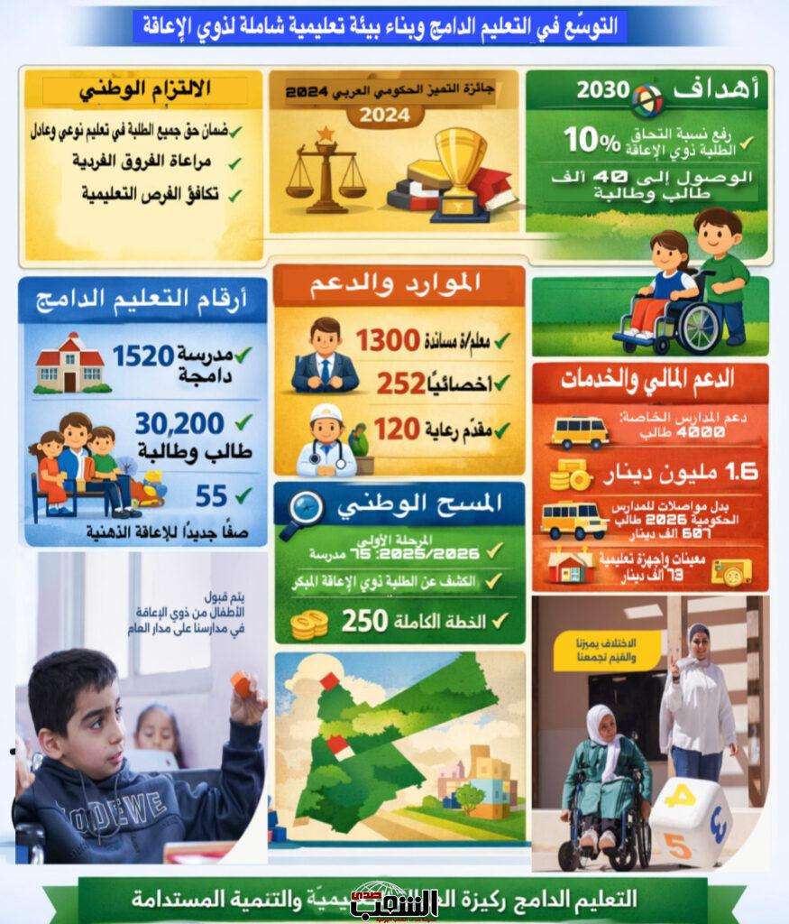 وأشار إلى أن عدد المدارس الدامجة في المملكة بلغ 1520 مدرسة، فيما وصل عدد الطلبة الملتحقين بالمؤسسات التعليمية إلى 30,200 طالب وطالبة، إضافة إلى تبسيط إجراءات تسجيل وقبول الطلبة ذوي الإعاقة للعام الدراسي 2025/2026، بما يسهم في تسهيل التحاقهم بالمدارس الحكومية.