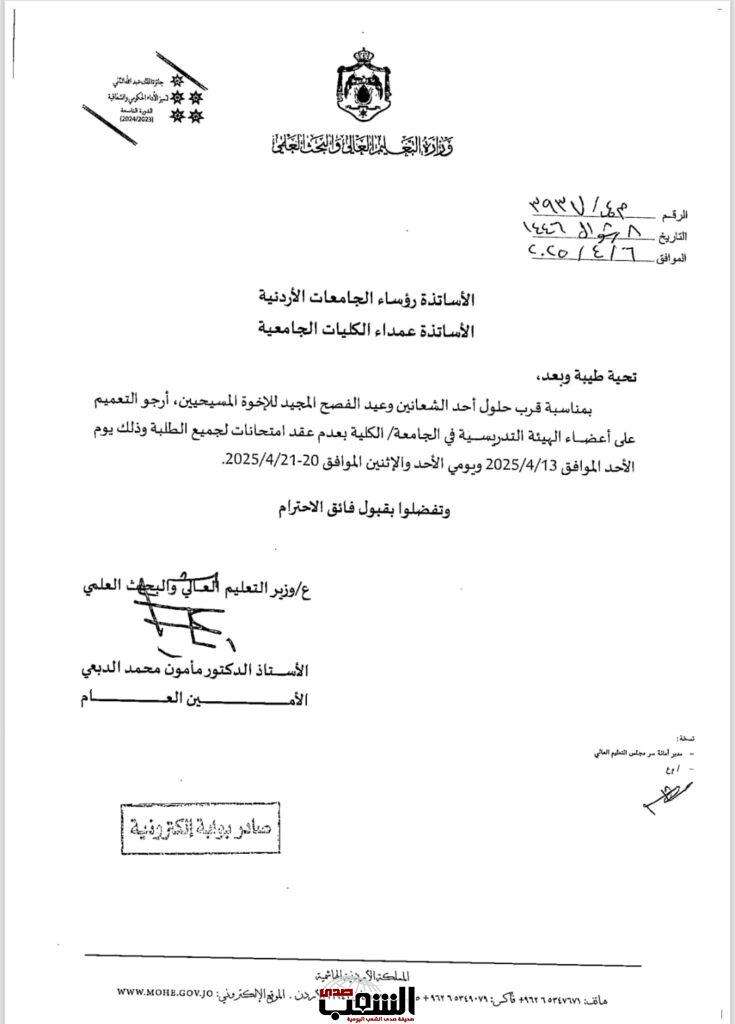 صدى الشعب – عممت وزارة التعليم العالي والبحث العلمي على الجامعات الأردنية، بعدم عقد امتحانات للطلبة في يوم أحد الشعانين 13/4، ويومي عيد الفصح الأحد والاثنين 20 و21/4.
