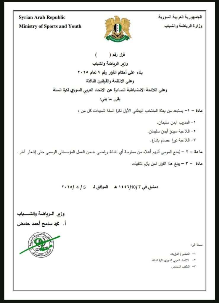 وجاء القرار الوزاري بعد مشاركة اللاعبتين صوراً لهما عبر حسابيهما الرسميين على منصة “إنستغرام”، ظهرتا فيهما مرتديتين قميص المنتخب الوطني وقد أُزيل منه العلم السوري الرسمي الجديد، وهو ما أثار موجة غضب واسعة بين المتابعين والجمهور الرياضي.