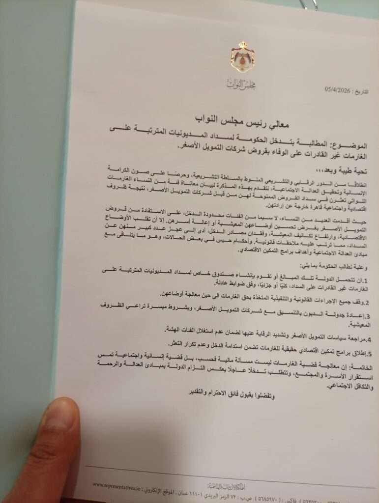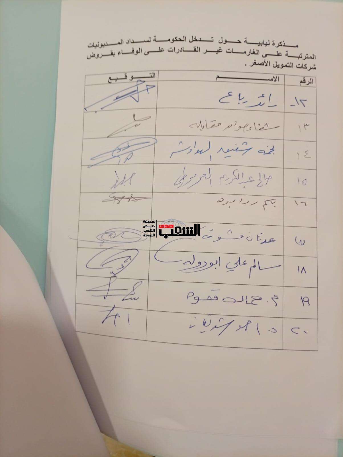 صدى الشعب - تبنى قرابة الـ20 نائباً مذكرة نيابية تطالب الحكومة عبر الأمانة العامة، بسداد ديون الغارمات غير القادرات على السداد. و أشارت المذكرة أن على الحكومة الإيفاء بالديون أو جدولتها بالتنسيق مع الشركات، مع توقيف كل الإجراءات القانونية عليهن..