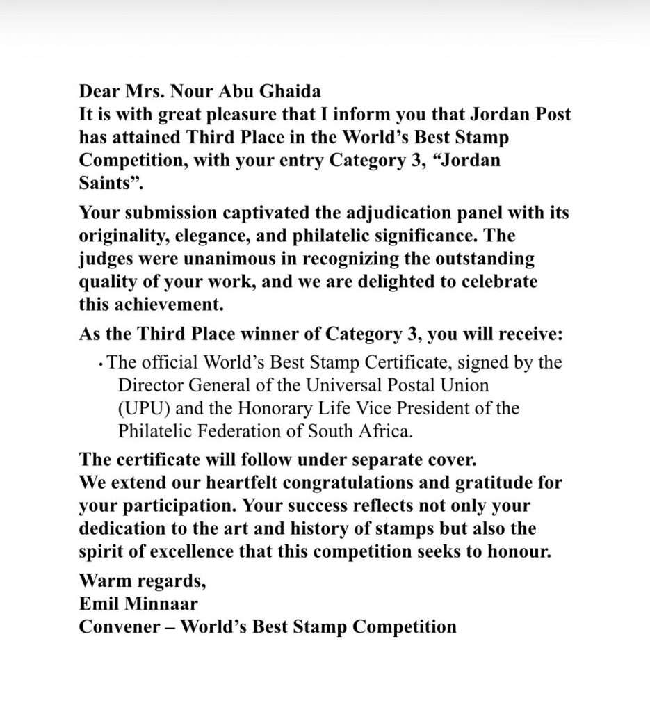 وجاء هذا الإنجاز ثمرة جهود مهنية وفنية متواصلة قادها البريد الأردني، من خلال مديرة مديرية الطوابع السيدة نور أبو غيدا، التي أشرفت بصورة مباشرة على ملف المشاركة الأردنية في المسابقة. وأسهمت أبو غيدا بدور محوري في اختيار وتطوير فكرة طابع “قديسو الأردن”، ومتابعة مختلف الجوانب الفنية والتقنية المرتبطة بإنتاجه، بما ضمن ظهوره بصورة تليق بمكانة الأردن التاريخية والدينية.