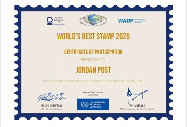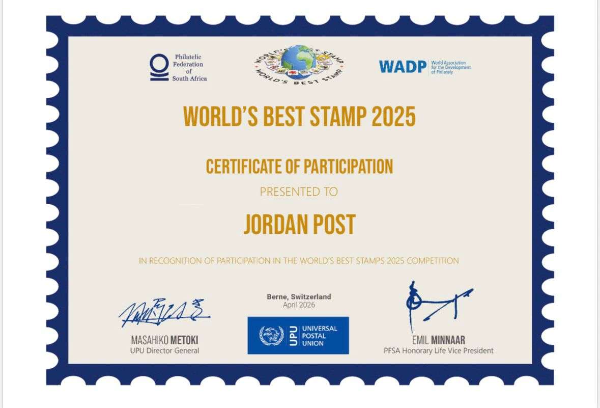 وأسفر هذا الفوز عن حصول البريد الأردني على شهادة “أفضل طابع في العالم” الرسمية، وهي شهادة مرموقة موقعة من المدير العام للاتحاد البريدي العالمي ونائب الرئيس الفخري لاتحاد هواة جمع الطوابع في جنوب أفريقيا، في تأكيد دولي جديد على جودة وتميز الطابع الأردني.