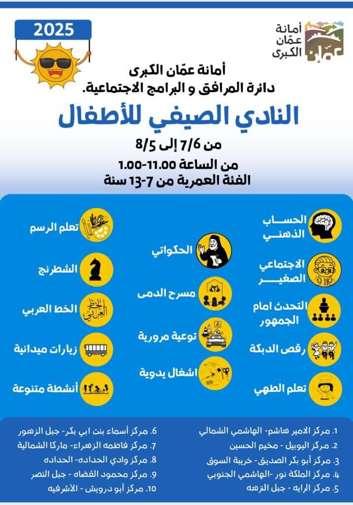 وتدعو أمانة عمّان الكبرى أولياء الأمور إلى المبادرة بتسجيل أبنائهم في النادي الصيفي للاستفادة من هذه الفرصة المميزة لتنمية مهاراتهم وقضاء عطلة صيفية ممتعة ومفيدة.