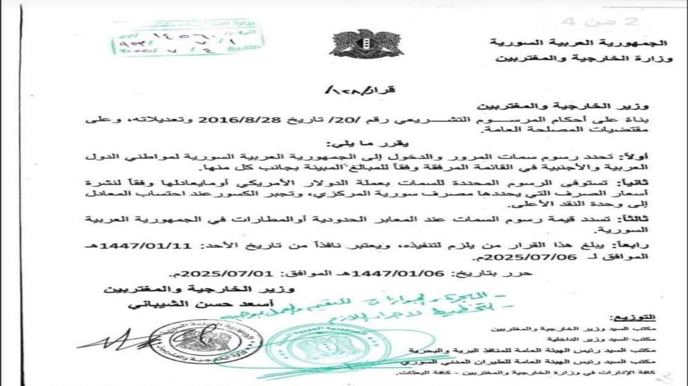 ويأتي القرار في ظل تزايد حركة الدخول إلى سوريا من قبل جنسيات مختلفة، سواء لأغراض تتعلق بالسياحة أو الاستثمار أو زيارات عائلية، في وقت تسعى فيه الحكومة السورية إلى ضبط عمليات الدخول وتحقيق موارد إضافية في مرحلة ما بعد الحرب.
