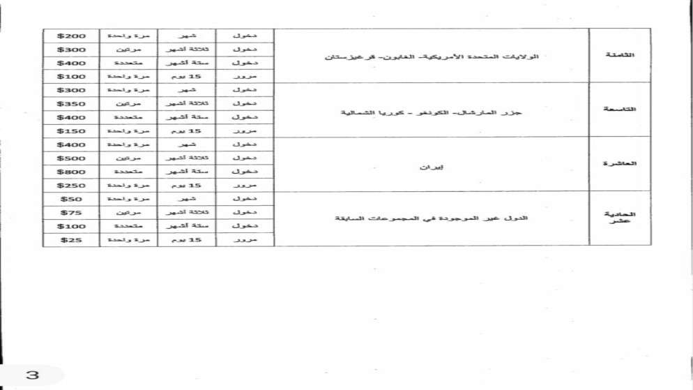 وتم تحديد رسوم خاصة لكل مجموعة، مع تباين في مدة الإقامة ونوعية التأشيرات (دخول أو مرور).