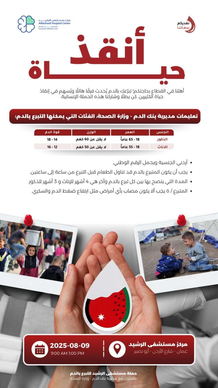 ندعو جميع أبناء المجتمع الأردني للمشاركة في هذه الحملة الإنسانية. تبرعك بقطرة دم واحدة ممكن تنقذ حياة، وهذا التفاعل بيعكس المواقف الوطنية والقومية الثابتة للقيادة الأردنية والشعب الأردني تجاه إخوانهم وأهلهم أينما كانوا.