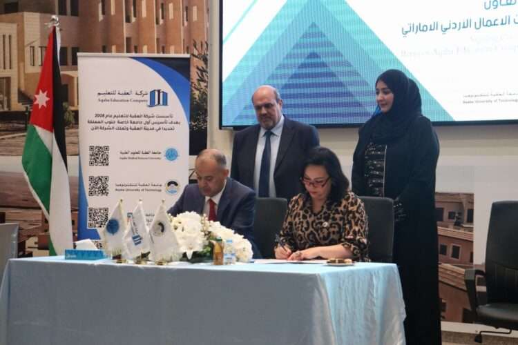 ووقّع الاتفاقية عن شركة العقبة للتعليم الأستاذ الدكتور محمد الوشاح، رئيس جامعة العقبة للتكنولوجيا، وعن المجلس السيدة سوزان المعايطة المستشار القانوني، بحضور كل من الأستاذ الدكتور أمجد الشطرات، رئيس جامعة العقبة للعلوم الطبية، والدكتورة أمل عبدالله الهدابي، رئيسة مجلس سيدات الأعمال الأردني الإماراتي.