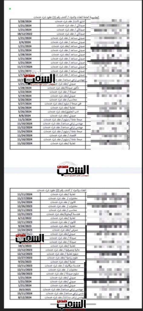 و قال المصدر في حديثها لـ(كواليس صدى) أن حجازي، أوقف عشرات تعيينات شراء الخدمات التي وافق عليها الرئيس السابق للمؤسسة العامة للغذاء و الدواء، الدكتور نزار مهيدات، قبل إحالته على التقاعد في 20-7-2025، وقدوم الدكتور رنا عبيدات خلفاً له، ليغلق الملف بشكلٍ كامل، جملةً و تفصيلاً، والتي من بينها 58 اسماً كما يوضح أحد الجداول: