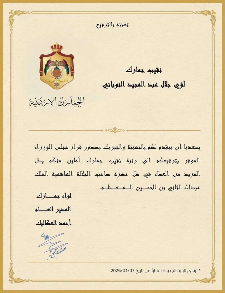 صدى الشعب – تتقدم الإعلامية فرح النوباني بأصدق التهاني والتبريكات إلى ابن عمّها نقيب الجمارك لؤي جلال النوباني، بمناسبة ترفيعه إلى رتبة نقيب، متمنّيةً له دوام التقدّم والنجاح في خدمة الوطن تحت ظل القيادة الهاشمية الحكيمة.