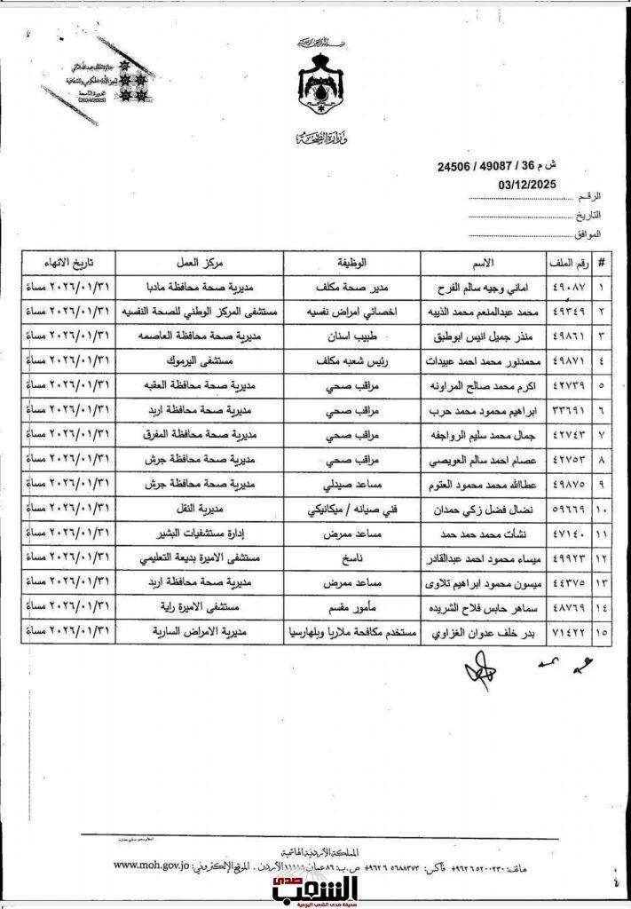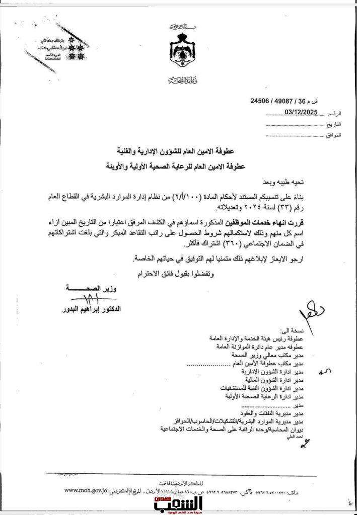 صدى الشعب – قرر وزير الصحة الدكتور إبراهيم البدور إلغاء قرار سابق بانهاء خدمات 15 موظفا في وزارة الصحة ممن بلغت اشتراكاتهم في الضمان الاجتماعي 360 اشتراكا فأكثر.