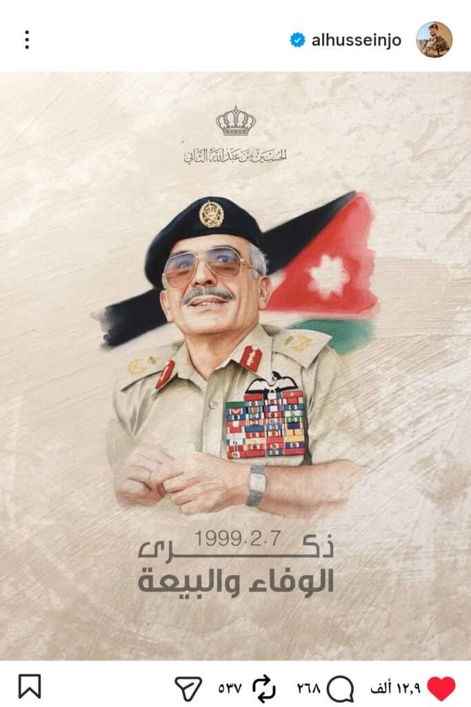 وقال ولي العهد عبر حسابه على “إنستغرام”: ” رحم الله جدي الحسين القائد الحكيم المعطاء.. وأطال الله بعمر أنبل الرجال جلالة سيدنا”.