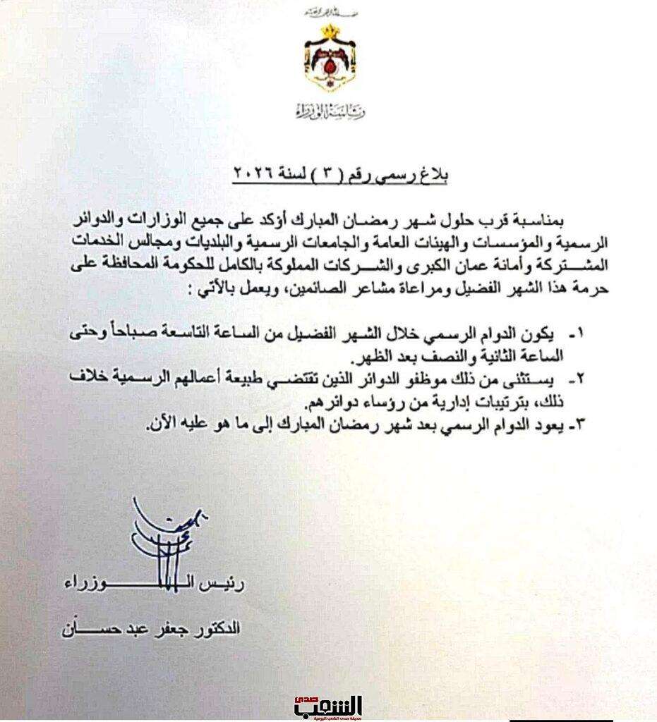 وبموجب البلاغ، تكون ساعات الدوام الرسمي في جميع الوزارات، والدَّوائر الرسميَّة، والمؤسَّسات، والهيئات العامَّة، والجامعات الرسميَّة، والبلديَّات، ومجالس الخدمات المشتركة، وأمانة عمَّان الكبرى، والشَّركات المملوكة بالكامل للحكومة، اعتبارا من الأول من رمضان، من الساعة التَّاسعة صباحاً وحتى الثَّانية والنِّصف ظهراً، على أن تعود بعد شهر رمضان المبارك إلى ما هي عليه الآن.