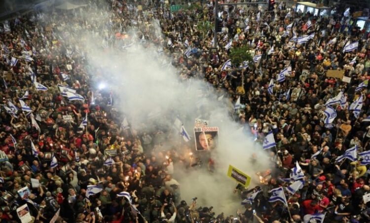 وقال المنظمون إن قرابة 100 ألف شخص تجمعوا عند مفترق طرق في تل أبيب أعيد تسميته “ميدان الديمقراطية”، منذ الاحتجاجات الحاشدة ضد التعديلات القضائية المثيرة للجدل العام الماضي.