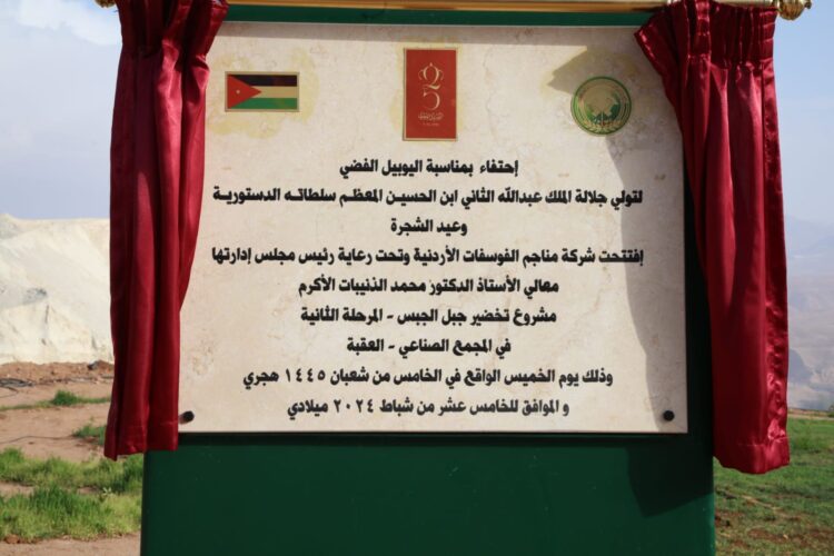 يذكر بأن شركة مناجم الفوسفات الأردنية قد دشنت المرحلة الثانية من مشروع تخضير جبل الجبس في المجمع الصناعي التابع للشركة في العقبة، وذلك بالتزامن مع احتفالات المملكة باليوبيل الفضي لتولي جلالة الملك عبدالله الثاني سلطاته الدستورية، وبمناسبة يوم الشجرة.