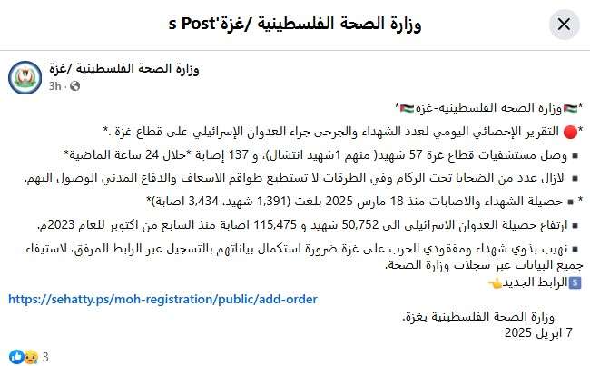 وأعلنت الوزارة “ارتفاع حصيلة العدوان إلى 50752 شهيداً و115475 إصابة منذ السابع من أكتوبر للعام 2023”.