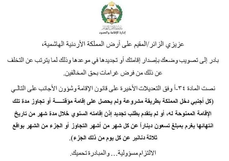 وأكدت المديرية، أن المادة (34/أ) من قانون الإقامة وشؤون الأجانب، وفقاً للتعديلات الأخيرة، تنص على أن كل أجنبي دخل المملكة بطريقة مشروعة ولم يحصل على إقامة مؤقتة، أو تجاوز مدة الإقامة الممنوحة له، أو لم يتقدم بطلب تجديد إذن الإقامة السنوي خلال شهر من تاريخ انتهائه، يُغرّم بمبلغ 90 ديناراً عن كل شهر من أشهر التجاوز أو جزء منه، وبواقع 3 دنانير عن كل يوم من ذلك الجزء.