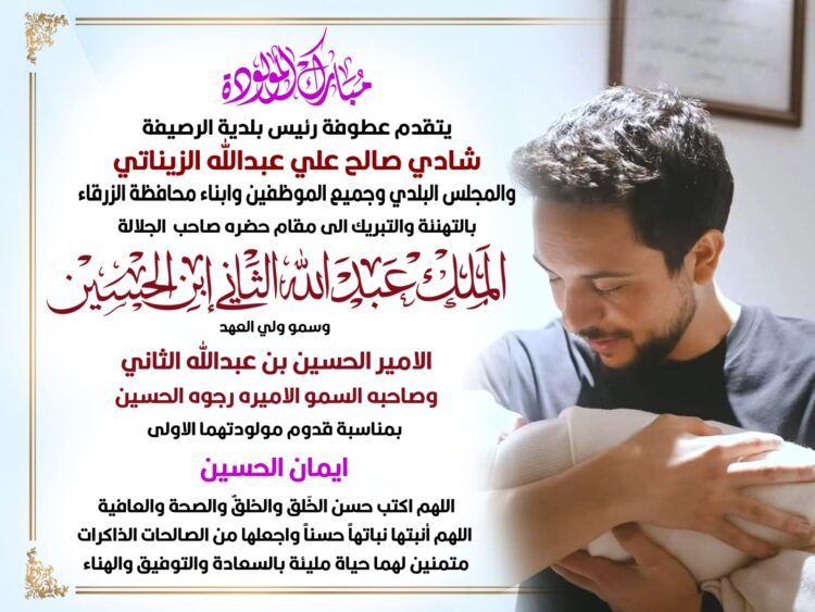 صدى الشعب – رئيس بلدية الرصيفة الاعلامي شادي الزيناتي واعضاء المجلس البلدي و موظفو البلدية يتقدمون باسمى ايات التهنئة والتبريك لجلالة الملك عبدالله الثاني ابن الحسين وجلالة الملكة رانيا العبدالله وصاحب السمو الملكي الأمير الحسين بن عبد الله الثاني ولي العهد وسمو الأميرة رجوة بقدوم مولودتهم الأولى ايمان بنت الحسين جعلها الله قرة عين لوالديها