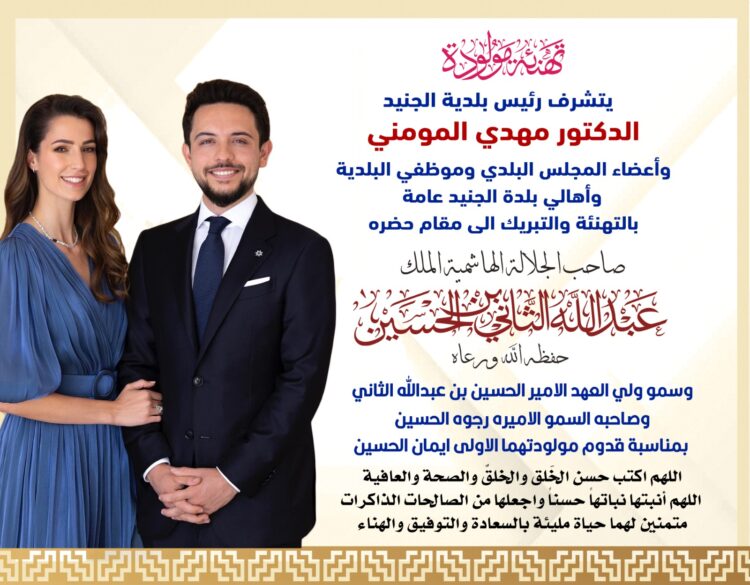 صدى الشعب – رئيس بلدية الجنيد الدكتور مهدي المومني واعضاء المجلس البلدي وموظفي البلدية يتقدمون بأسمى آيات التهاني والتبريكات من صاحب الجلالة الهاشمية الملك عبدالله الثاني ابن الحسين المعظم وجلالة الملكة رانيا العبدالله وولي العهد الأمين الأمير الحسين وسمو الأميرة رجوة الحسين حفظهم الله ورعاهم بمناسبة قدوم الأميرة إيمان بنت الحسين بن عبدالله الثاني المعظم ومهنئين الأسرة الهاشمية الكريمة والأسره الأردنية الكبيرة بهذه المناسبة السعيدة