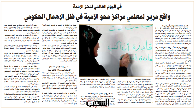 في زوايا مراكز محو الأمية والتي تنتمي إلى وزارة التربية والتعليم حيث يصادف الأحد اليوم العالمي لمحو الأمية، تجد شبحًا من الإهمال يتجسد في معاناة عشرات المعلمات، اللواتي يفترض بهن أن يكن نورًا يضيء طريق المعرفة والتعلم لأفراد المجتمع، لكن، للأسف، الواقع يشي بخلاف ذلك تمامًا، إذ تعاني هؤلاء المعلمات من مجموعة من الانتهاكات والممارسات التي تجعل من وضعهن عبارة عن معاناة يومية لا تنتهي.