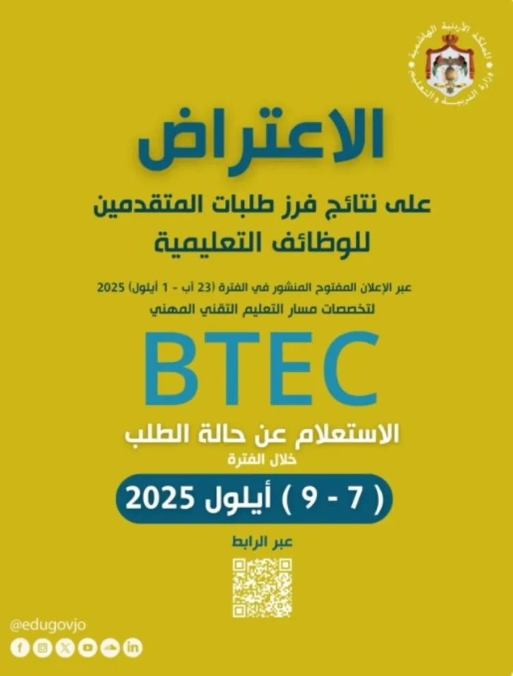 صدى الشعب – أعلنت وزارة التربية والتعليم عن نتائج فرز طلبات المتقدمين للوظائف التعليمية لغايات التعيين في تخصصات مسار التعليم التقني المهني BTEC، والمتقدمين من خلال الإعلان المفتوح الذي تم نشره خلال الفترة من 23/8/2025 ولغاية 1/9/2025.