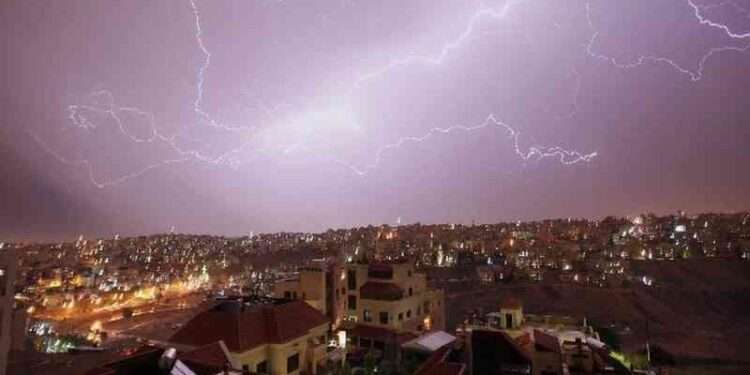 ومع ساعات العصر تعبر الجبهة الهوائية الباردة، حيث تشتد الهطولات المطرية وتكون غزيرة أحياناً في شمال ووسط المملكة والمناطق الجنوبية الغربية، إضافة إلى مناطق الأغوار والبحر الميت، وقد تصحبها العواصف الرعدية وتساقط البَرَد، ما يؤدي إلى تشكل السيول في الأودية والمناطق المنخفضة وارتفاع منسوب المياه.